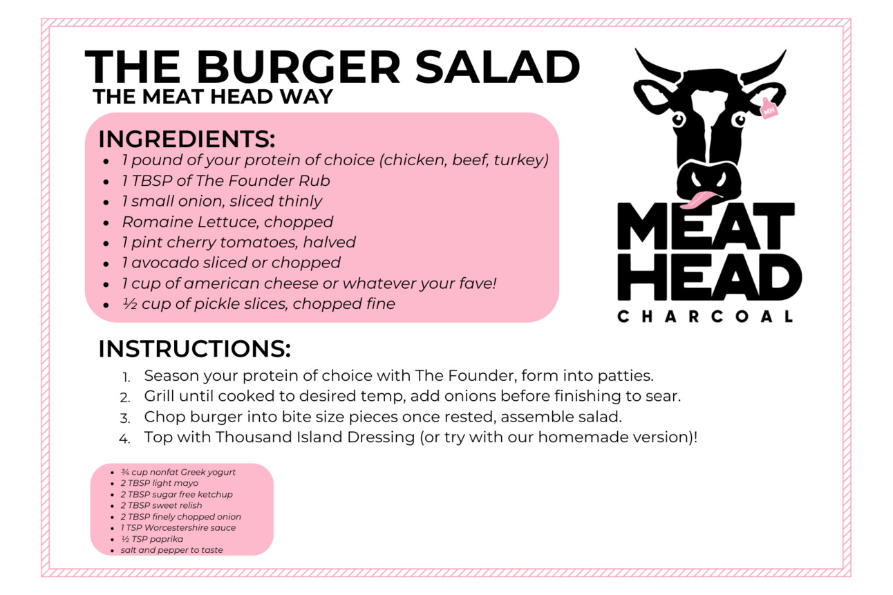 The Burger Salad is just as it seems- it’s your favorite meal to grill, but without the bun! You can tweak those ingredients however you see fit, but here’s how we like to do it.
